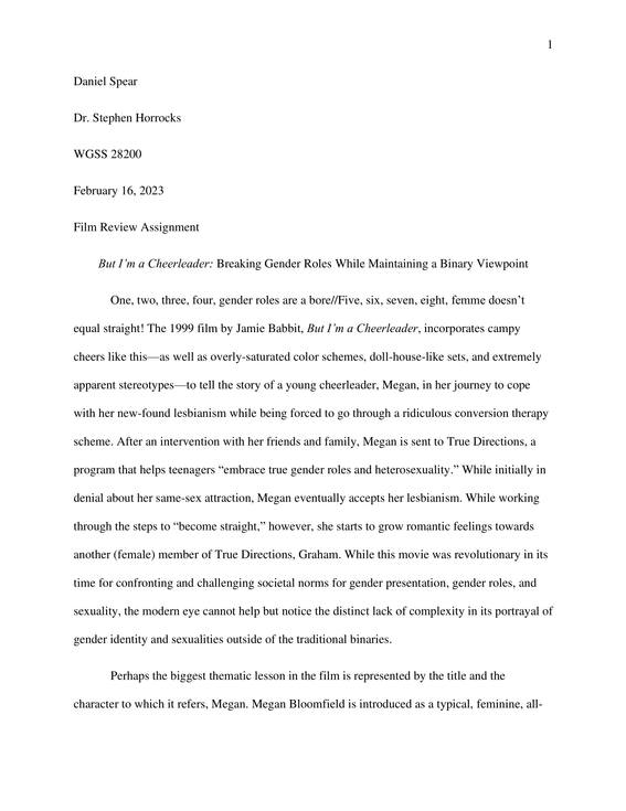In my pursuit of Film & Video Studies, I have done several film analyses. This essay also incorporates my minor in LGBTQ studies, serving as my final paper for my Intro to LGBT Studies course. In it I explore how the movie But I'm A Cheerleader (1999), directed by Jamie Babbit, served as a revolutionary portrayal of gender expression and sexuality for its time period, as well as discuss some of its criticisms and shortcomings.